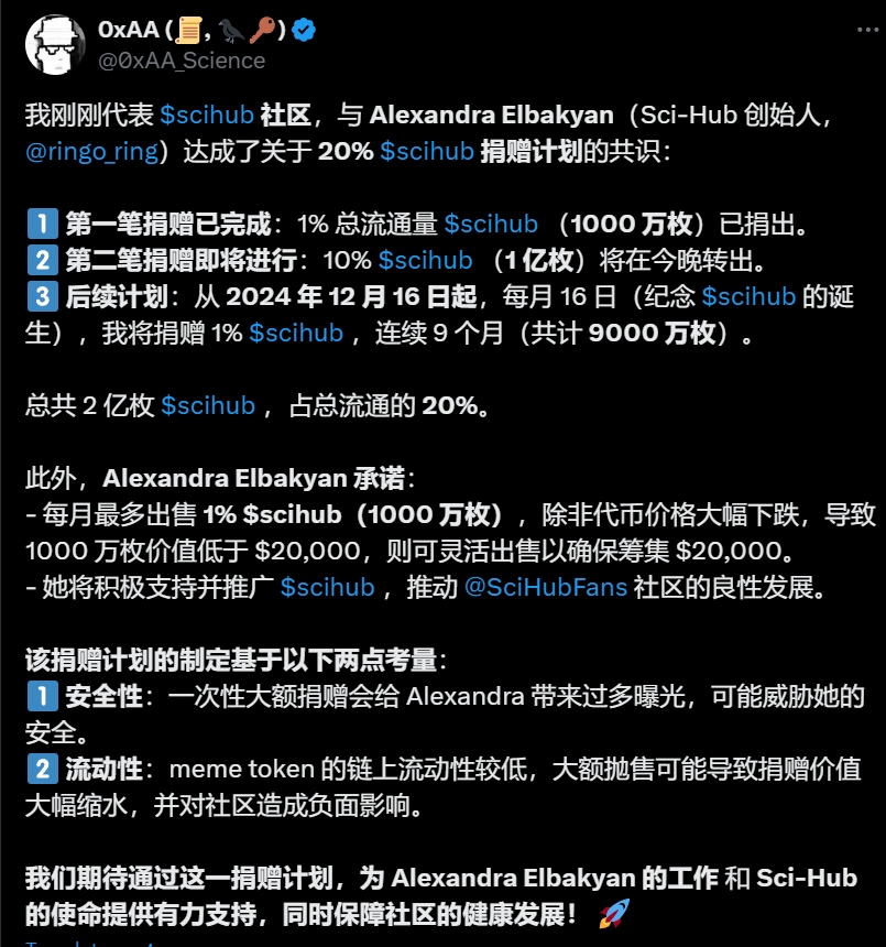 2024年11月16日,@0xAA_Science发文称发现最早的scihub meme,随后11月17日,@0xAA_Science给Alexandra Elbakyan 捐赠了20% $scihub的消息放出导致该代币大涨。